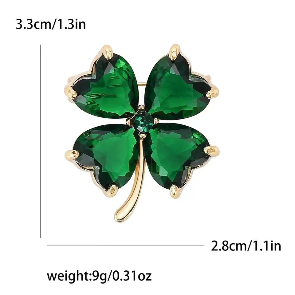 Expertly crafted from metal with IP gold plating, this women's brooch features a delicate green crystal four leaf clover and emerald heart design. Its eye-catching and trendy style make it perfect for daily wear or special occasions. The lead-tin alloy construction ensures long-lasting color preservation. A must-have addition to any fashion-forward wardrobe.