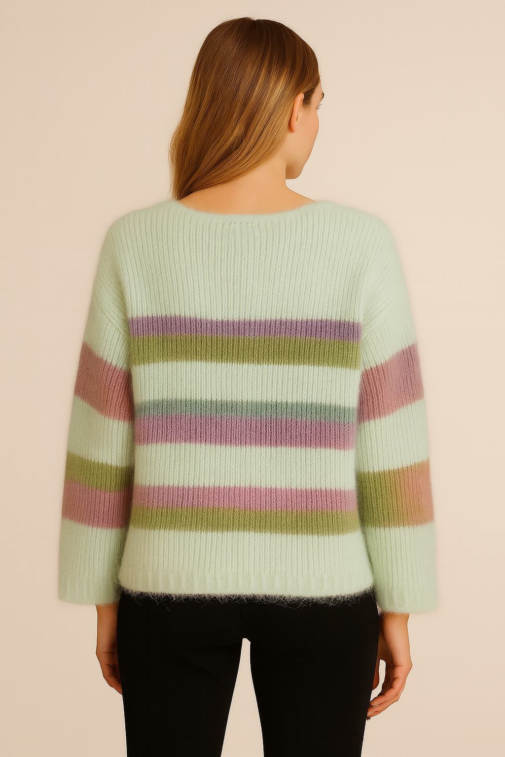 The MISS GOODLIFE V NECK STRIPs jumper (style no. MG8008) blends comfort and style in a delightful pastel palette. Crafted from 70% wool and 30% alpaka, it offers warmth with an airy, plush feel. Featuring wide horizontal stripes in muted tones and a flattering V-neck, this piece is an instant mood-lifter for your wardrobe.