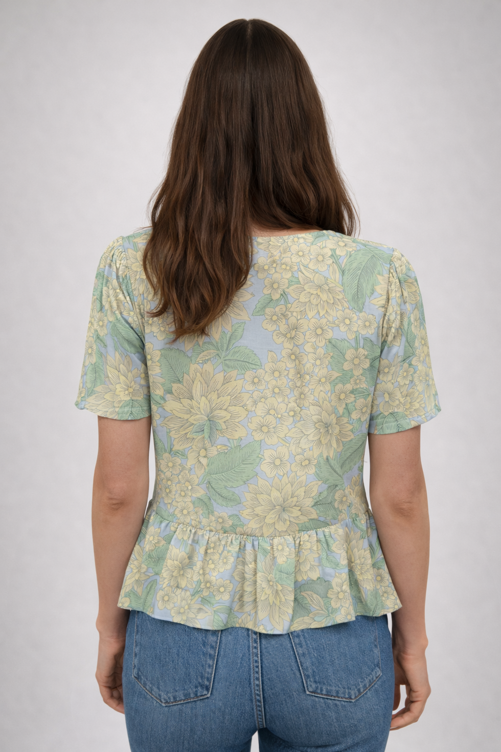 Fresh, feminine, and effortlessly chic, this Rich & Royal floral top is designed to bring softness and style to everyday dressing. Featuring a delicate floral print in calming pastel tones, it offers a flattering silhouette with subtle gathers at the shoulders and a gently flared peplum hem.