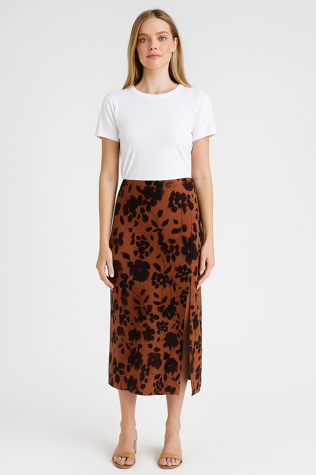 Scoop neck shorter long sleeve top and maxi skirt with side split