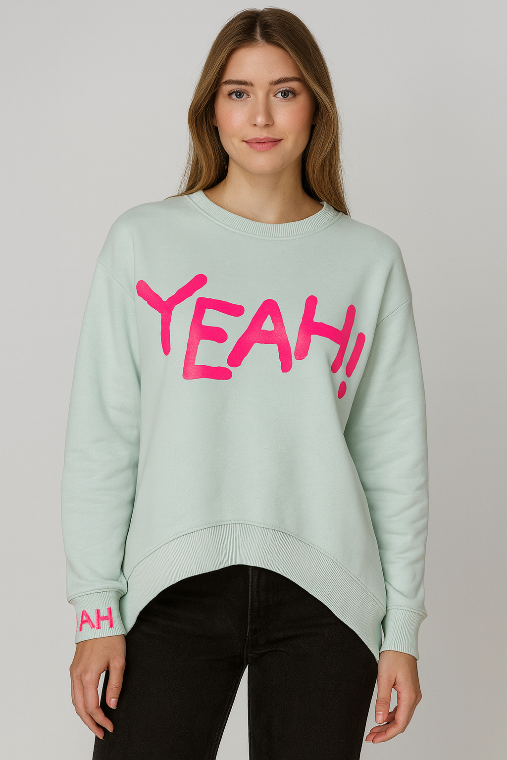 Make a bold statement with the Miss Goodlife V-Neck Jumper, featuring a striking pink base with neon pink “Yeah!” lettering. Crafted from 100% BAUMWOLLE (cotton), this piece offers breathable comfort and a soft feel.