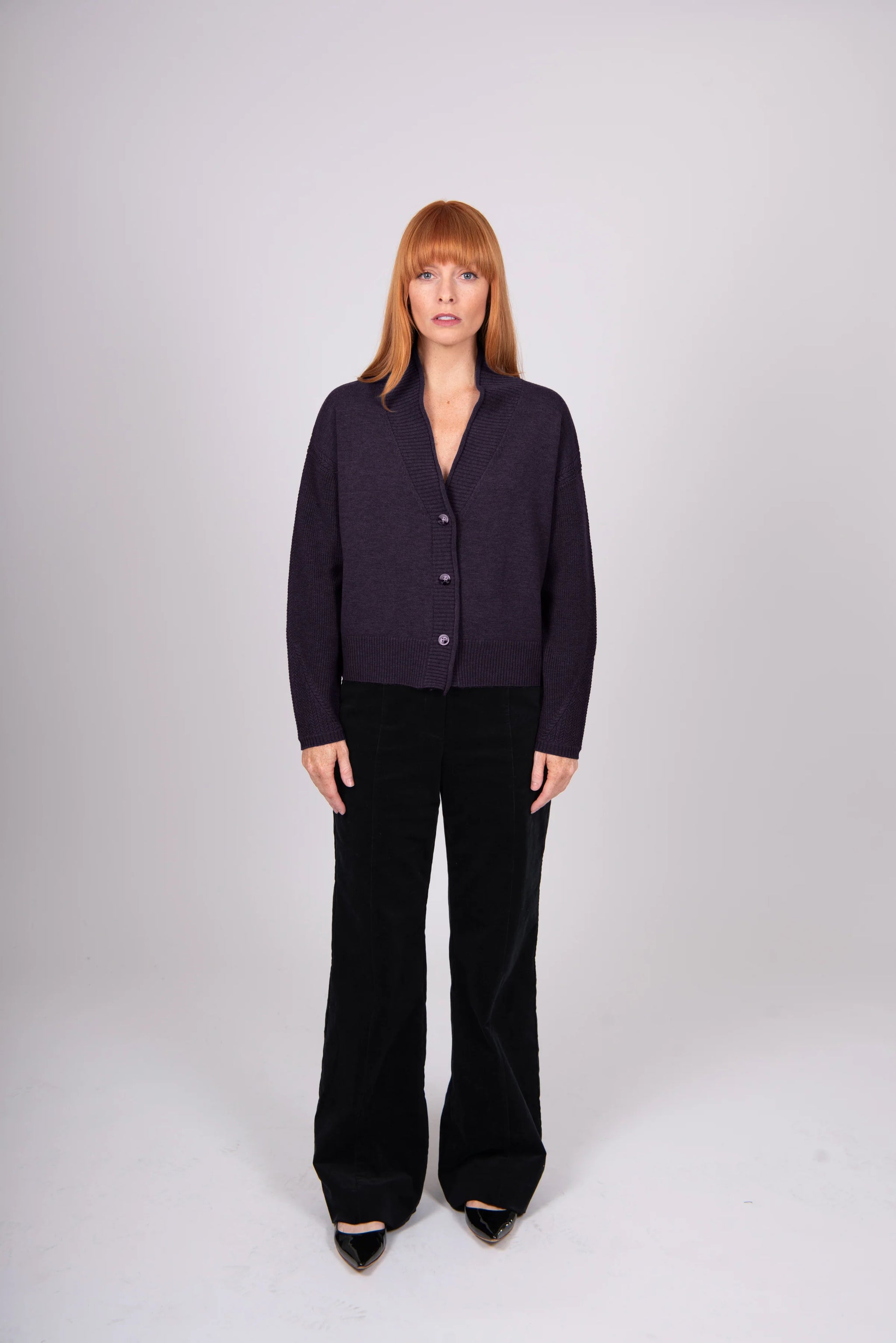 With a shawl collar design, this cardigan likely has a relaxed, elegant look—perfect for layering in cooler weather, offering both comfort and refined style.