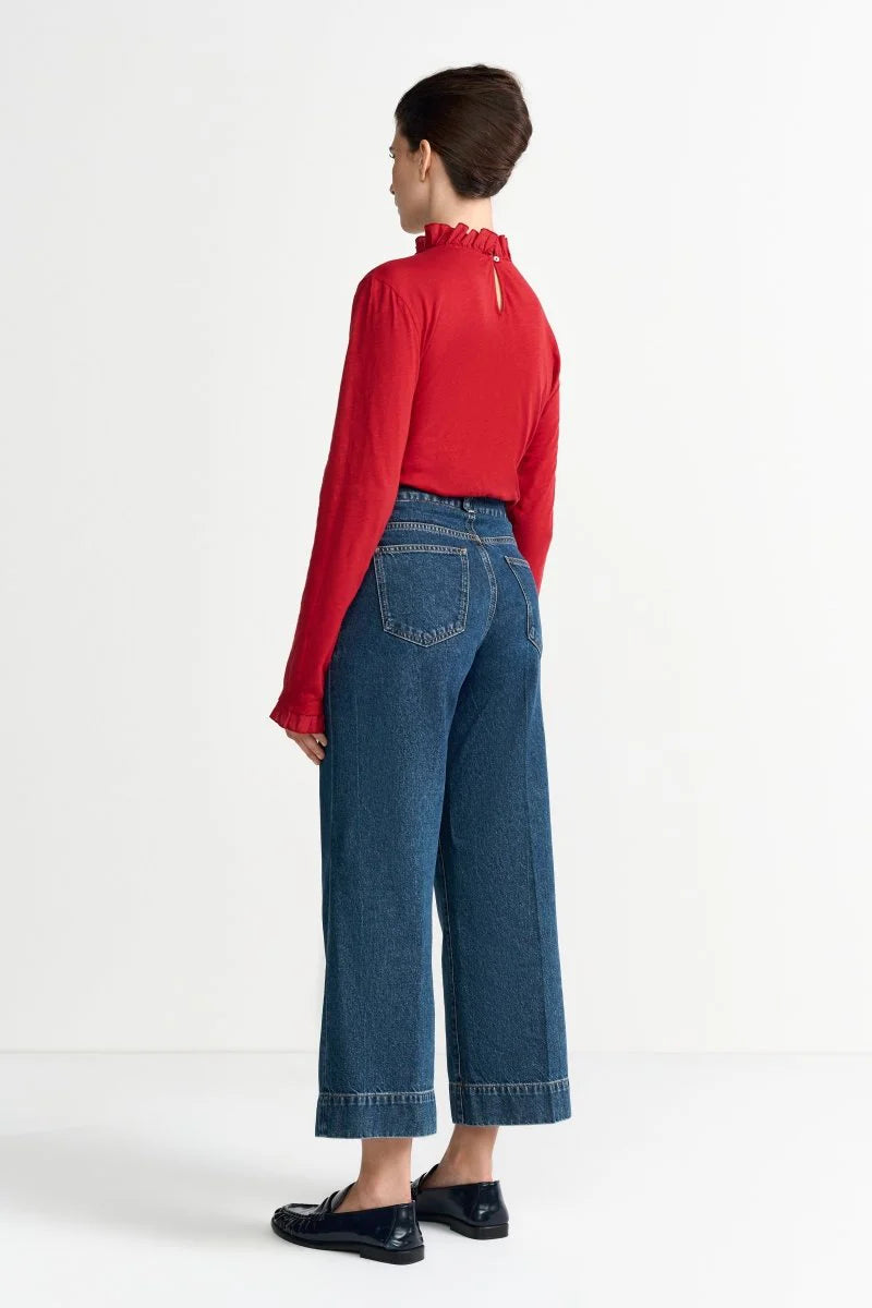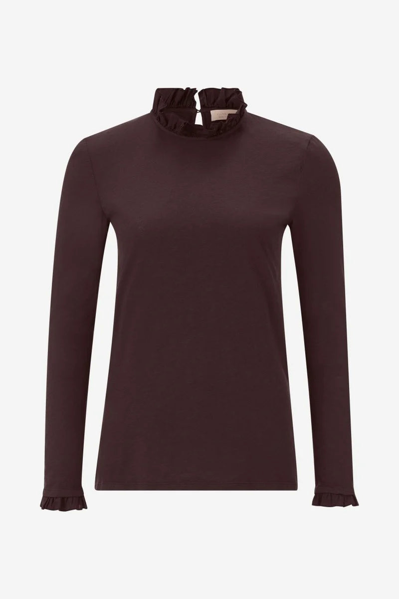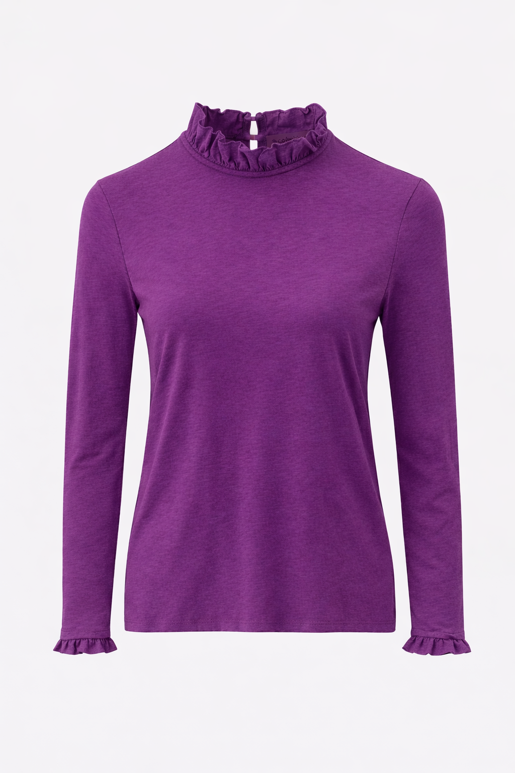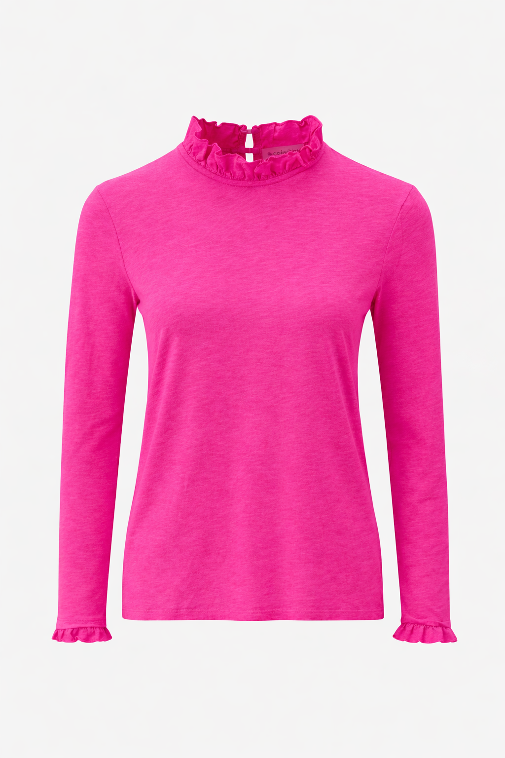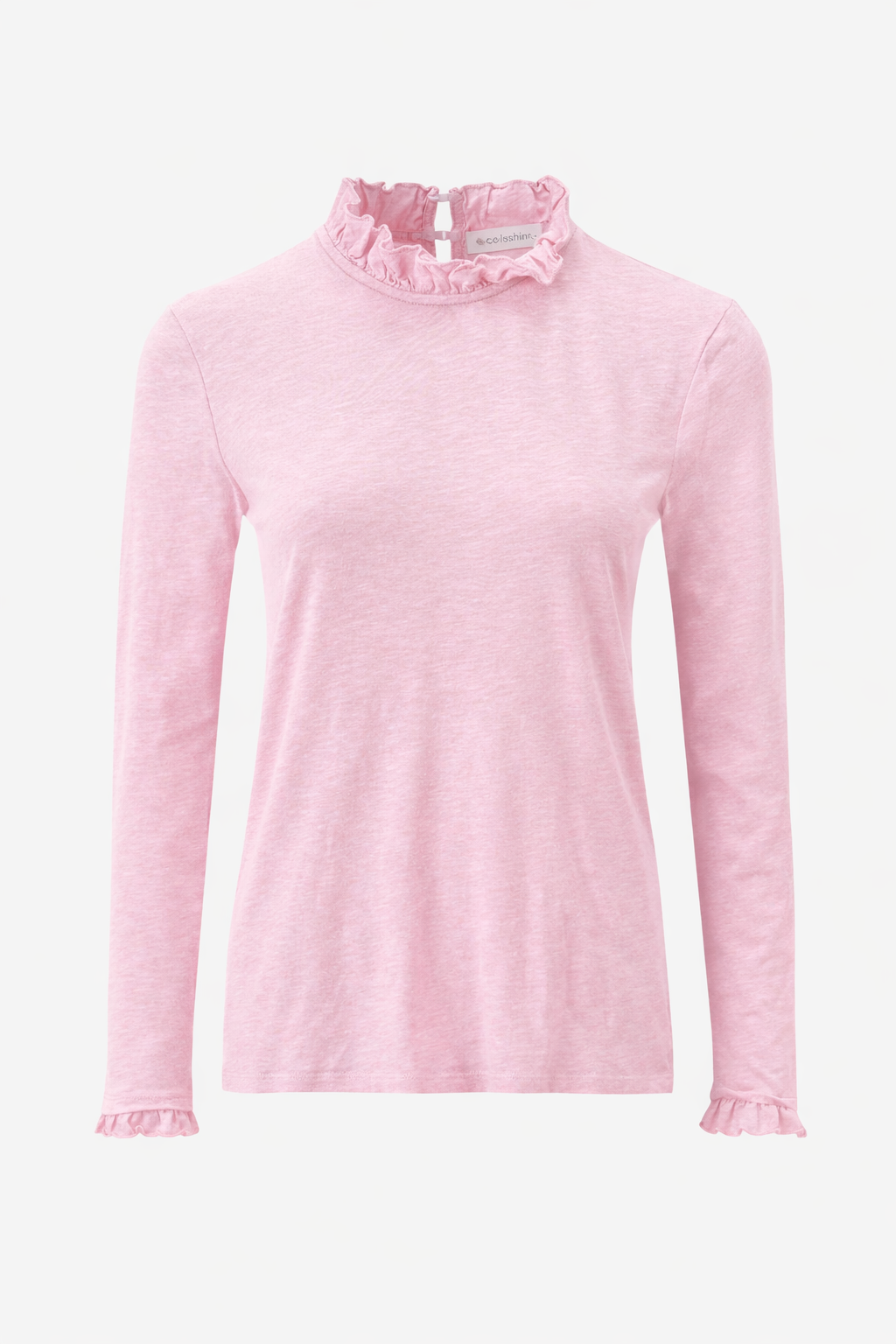 This romantic slub long-sleeved top adds a playful touch to your looks thanks to its frill collar and ruffled sleeves! The soft slub cotton jersey provides a subtle distressed look.