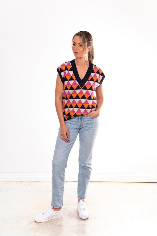 Featuring a bold, geometric triangle jacquard design, this vest brings a modern edge to classic knitwear. The V-neckline and contrasting ribbed trims on the neck and armholes add a refined finish, making it a perfect layering piece for transeasonal styling.